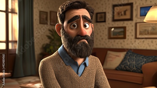 man, bearded, hispanic, three-dimensional, cartoon, cosy, living, room, sceptical, nervous, frown, upset, expression, problem, negative, character, emotion, interior, design, living room, atmosphere, stress, worry, discomfort, personality, illustration, facial, feature, feeling, ambience, situation