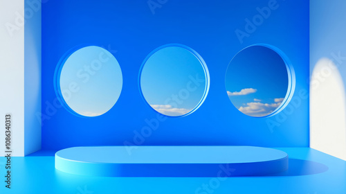 three-dimensional, circular, window, stage, room, blue, sky, white, cloud, view, elegant, modern, background, travel, vacation, minimalism, refreshing, fashion, cosmetic, beauty, wallpaper, empty, copy space, spa, salon, relaxing, comfortable, sleep, happy, sunshine, bright, summer, ocean, sea, light, luxury, beautiful, hotel, display, space, lifestyle, decoration, three-dimensional, water, clean, shiny, contemporary, resort, illustration