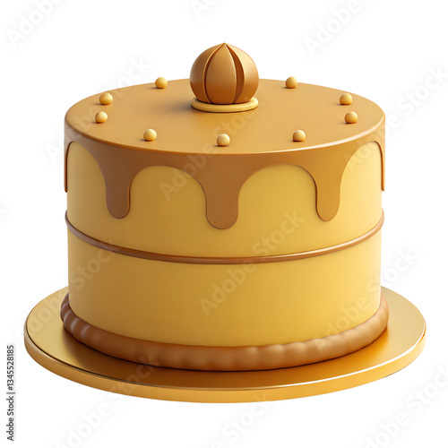 3D Elegant two-tier cake with caramel frosting, sphere topping, and decorative balls, a sweet indulgence. Minimal 3d cartoon render, isolated on a transparent background, PNG.