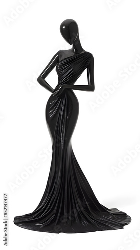 3D Fashion shiny black female mannequin wearing black dress isolated on white background. Black body silhouette, dressmakers dummy