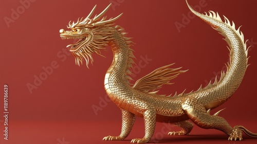 3d Full body golden dragon in bend body pose, red background