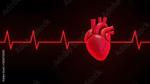 3D heart model with EKG line and pulse monitor, glowing red, black background.