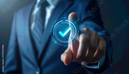 businessman, hand, hologram, checkmark, interaction, technology, futuristic, virtual, digital, innovation, success, approval, corporate, office, gesture, concept, modern, progress, startup, communication, network, interface, design, visualisation, security, marketing, education, presentation, advertisement, training, professional, future, workplace, leadership, achievement