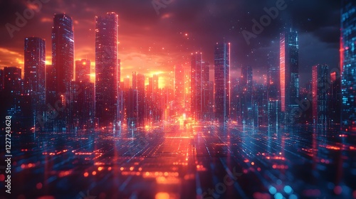 3D holographic city with transparent skyscrapers and moving digital elements with copy space