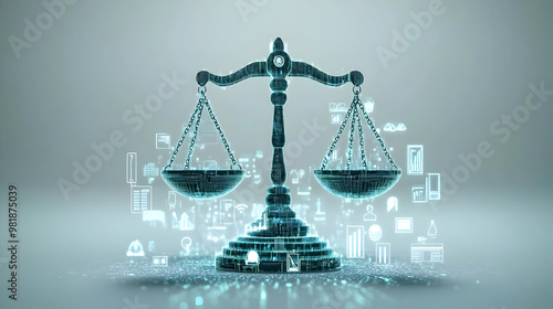 3D Holographic Policy Scales Balancing Issues Concept: Wide Shot of Glowing Icons on Scales with Ample Copy Space for Policy Discussion