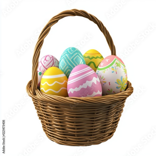 3D icon cartoon basket filled with Easter eggs, isolated on a white background --quality 2