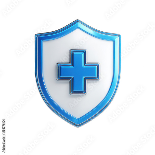 3D icon of a shield with a medical cross, in blue color on a white background, png, transparent