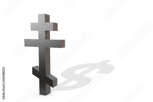 3d illustration: Black Christian Orthodox cross with a shadow in the shape of a dollar symbol isolated on white background. The concept of business-financial relations between Church and parishioner.