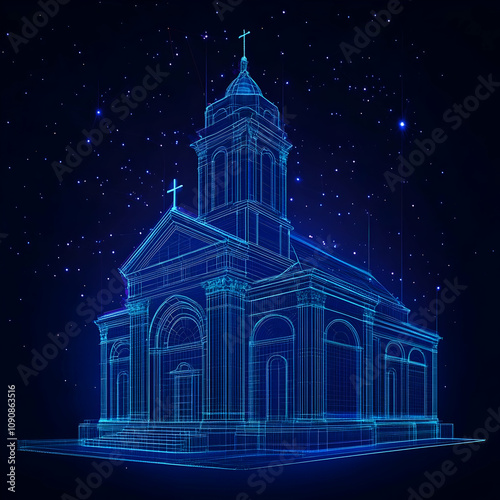 religion, universe, neon, innovative, spiritual, design, abstract, blueprint, star, chapels, night, construction, contemporary, line, three-dimensional, polygon, wireframe, cathedral, light, holy, digital, church, christianity, faith, visualisation, render, sky, technology, glowing, grid, sacred, starry, worship, blue, architecture, mesh, prayer, space, futuristic, glow, computer graphic, illustration, dark, model, modern, building
