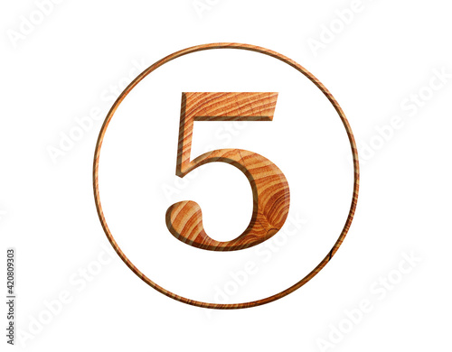 3D illustration hard wood plank number 5 , brown color alphabet, circle round design element , isolated on white