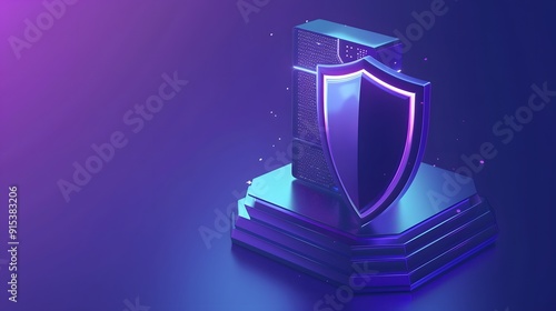 3D illustration of cybersecurity concept showing a server with a shield symbolizing data protection, digital security, and privacy.