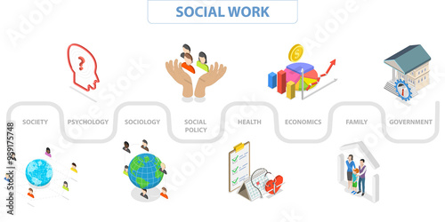 3D Isometric Flat Illustration of Social Work, Society and Community