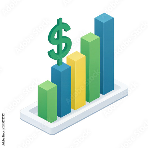 3D minimalistic bar graph with green, yellow, and blue bars represents financial growth, featuring dollar sign symbolizing economic success