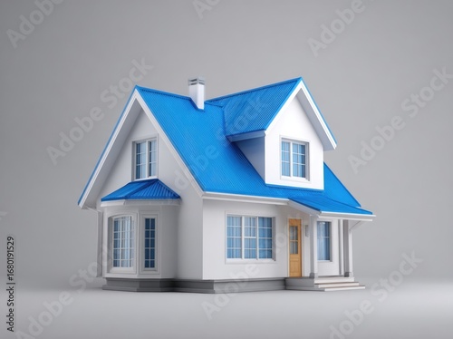 house, home, building, three-dimensional, model, residential, white, blue, metal, roof, exterior, structure, architecture, modern, design, simple, family, front, perspective, illustration, render, image, geometric, symmetric, contemporary, realism, property, real estate, construction, housing, classic, suburb, isolated, studio, digital, rendered, small
