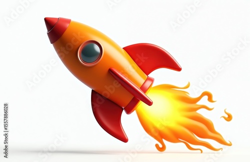 3D model rocket toy with flames in flight against white background. Orange red spacecraft ready to launch into space. Space travel, adventure, exploration, take off, futuristic, playful, childish