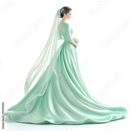 3D porcelain figurine of a beautiful canopy in a mint outfit, isolated, on a white background. A resource for creativity, a template for a wedding cake, a decorative element for presentations of weddi