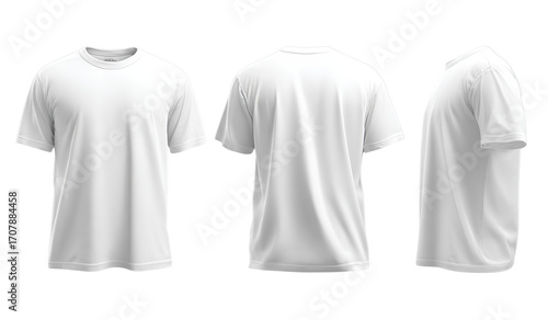 3d realistic white t-shirt, front view, back side, and top-down view on a transparent background