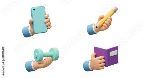 3D Render: Hands Holding Phone, Pencil, Dumbbell, and Book