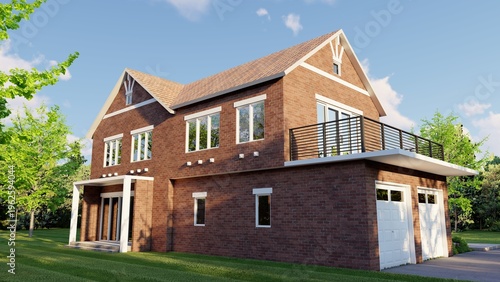 3D render of a modern two-story red brick suburban family house with double garage and balcony terrace