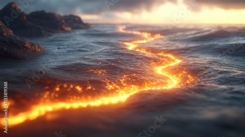 3D render of a retro-style futuristic landscape with neon lights casting a glowing effect on the sea and mountains at sunset. Soft blur and minimalistic design.
