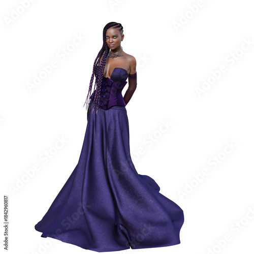 3D rendered beautiful woman with a captivating long purple dress isolated on a transparent background