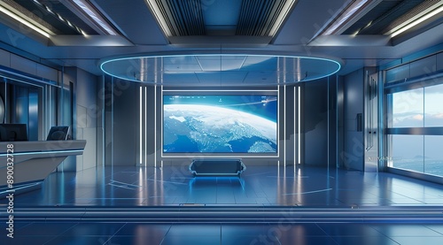 3D rendering of a virtual TV studio news set with a blue and white color theme
