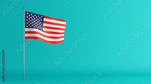 3D rendering of an American flag on a pole, isolated on a turquoise blue background with copy space, studio shot.