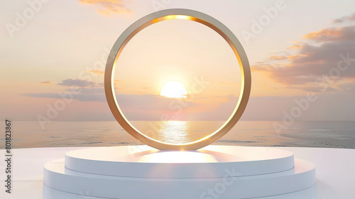sunset, sky, sea, gold, circular, dais, white, cosmetic, presentation, showcase, stage, platform, beauty, display stand, glamour, modern, elegant, stylish, exhibition, event, marketing, branding, promotional, merchandising, luxury, high-end, fashionable, make-up, skincare, beauty product, spotlight, advertisement, artistic, elegance