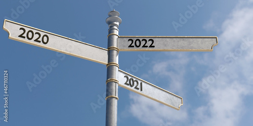 3D Sign of year dates from 2020 to 2022 on a blue sky background