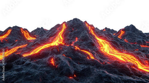 three-dimensional, volcanic, mountain, lava, flowing, glowing, stream, molten, rock, terrain, fire, eruption, bright, red, heat, ash, magma, fissure, explosion, dramatic, dangerous, active, energy, environment, geology, formation, fractured, natural, intense, power, ground, hill, texture, rugged, fiery, slope, flames, destruction, flow, black, detail, crack, surface, volcano, glow, isolated, transparent, background