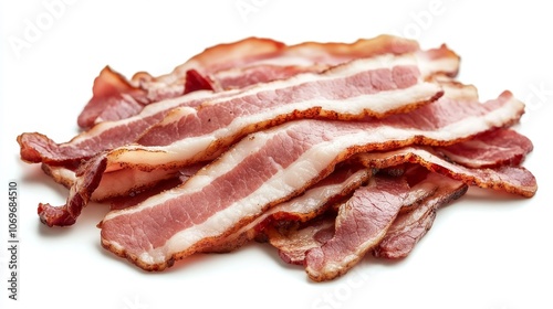 46.Freshly sliced streaky bacon isolated on a white background, detailed marbling with pink and white layers, thin slices with a slightly curled edge, clean and appealing for package design