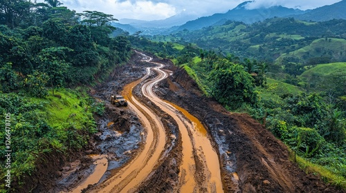 road, muddy, mountain, rainforest, tropical, vehicle, jungle, travel, adventure, offroad, nature, landscape, forest, green, dirt, car, drive, journey, remote, exploration, wilderness, scenic, lush, terrain, hill, vale, cloud, sky, transport, expedition, freedom, challenge, destination, tour tourism, vacation, summer, wild, beauty, picturesque, environment, ecology, tree, plant, rain, wet, mud