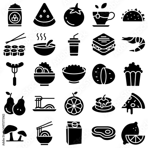 food, fast food, organic, vegetable, fruit, icon, symbol, solid, vector, illustration, design, glyphs, signs, set, web, graphic, black, icon, snack, cookie, orange, fast, seafood, fish, meat, beef, steak, drumstick, chicken, salad, bowl, rice, spaghetti, noodle, sushi, candy, chocolate bar, battercake, milk, juice, fresh, donut, potato, lettuce, healthy, diet