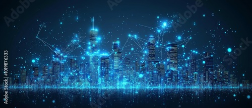 digital, connectivity, city, skyline, blue, toned, dot, line, glowing, datum, device, signal, particle, effect, technology, network, motion, futuristic, infrastructure, scalable, geometric, shape, precision, illustration, clean, vector, art, panorama, wide, banner, title, landscape, horizontal, hero, background, desktop, wallpaper