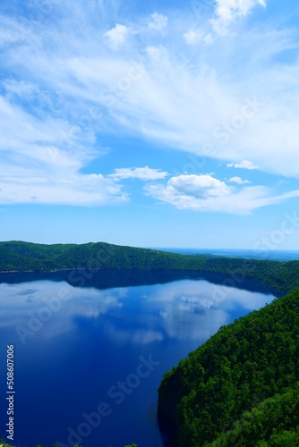 national park, hokkaido, japan, asia, lake, water, caldera, cobalt, azur, blue, reflex, water surface, waterfront, lakeshore, green, season, transparent, clear, nature, environment, showplace, celebrate, resort, travel, tour tourism, tourist attraction, mystical, ainu, lookout, landscape, view, blue skies, blue, cloud, sunny, weather, weather, lovely