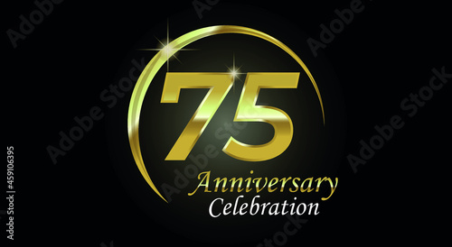 75 years anniversary celebration. Anniversary logo with ring in golden color isolated on black background with golden light, vector design for celebration, invitation card and greeting card