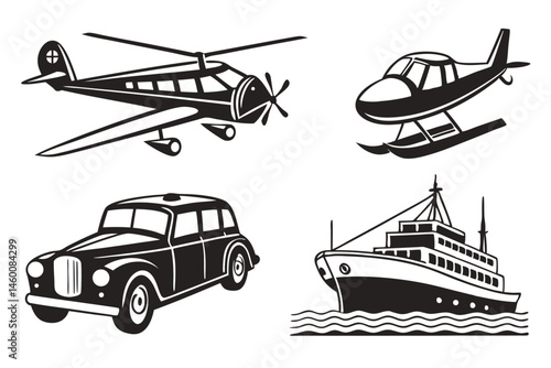 76 Silhouettes of various transportation modes, black and white icons, diverse vehicles, air land and sea transport, simplified shapes, flat design, travel and transportation themed, vector style illu