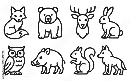 8 black and white linear icons (silhouettes) in a minimalist style, related to the theme of forest and wild animals