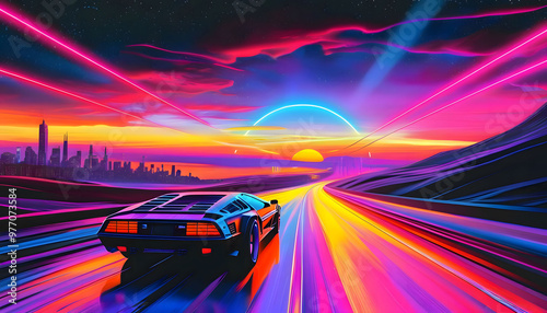 80s retro futuristic drive background with vintage car. Stylized sci-fi city landscape in outrun VJ style, night sky. Vaporwave illustration for EDM music video, DJ set, club. 4k