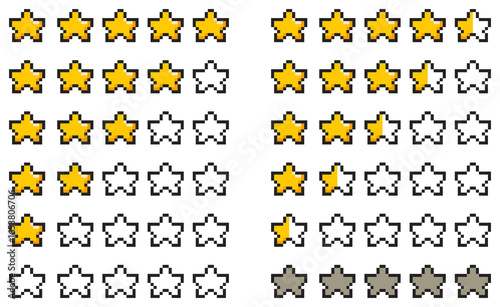 8-bit pixel art star rating icons set. retro video game feedback and review system