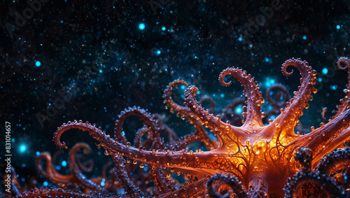 8K photo quality,(((masterpiece))),(best quality),((ultra-detailed)), professional,gimicalmas,fluid parametric digital cybernetic patterned octopus in the blooming nature coral structures, web, bubble