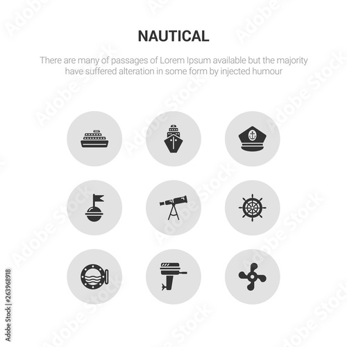 9 round vector icons such as boat screw, boat engine, boat porthole, steering wheel, telescope contains buoy, captain hat, cargo ship front view, cruise ship. screw, engine, icon3_, gray nautical