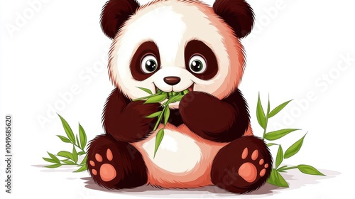 a 2D cartoon illustration of a baby panda eating bamboo, cute and fluffy, white background