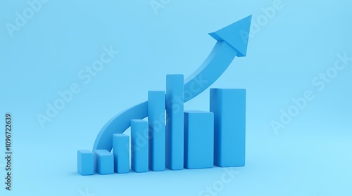 A 3D bar graph rendered in blue, featuring an upward arrow symbolizing growth. Bars increase in height from left to right, highlighting progress.