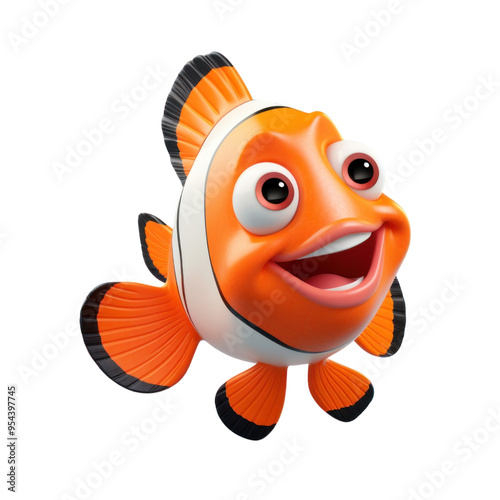fish, cartoon, three-dimensional, render, animation, clownfish, orange, white, smile, happy, cute, character, aquatic, ocean, underwater, marin, life, animal, sea, tropical, reef, nature, design, illustration, art, graphic, vector, icon, mascot, logotype, symbol, funny, playful, joy, fun, children, children, joyful, sweet, adorable, charming, cheerful