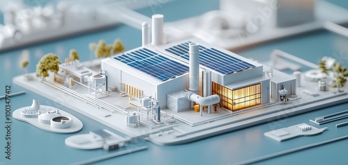 A 3D cutaway model of a factory with solar panels, machinery, and greenery. Bright atmosphere. Solar Cell Energy Concept
