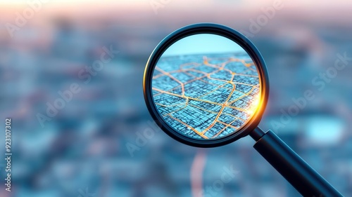 A 3D magnifying glass shining light on a digital map, revealing pathways of information, symbolizing search navigation