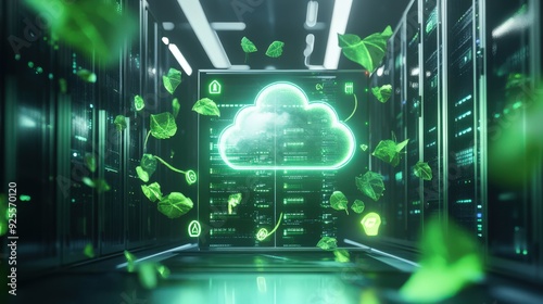 A 3D rendering of a cloud server surrounded by green energy symbols, representing eco-friendly cloud technology.