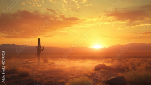 A 4K image of a cactus standing tall under a golden-orange sky, the sun setting behind it and casting vibrant colors over the desert horizon