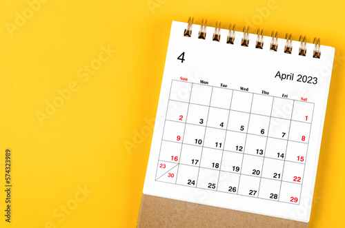 A April 2023 Monthly desk calendar for 2023 year on yellow background.